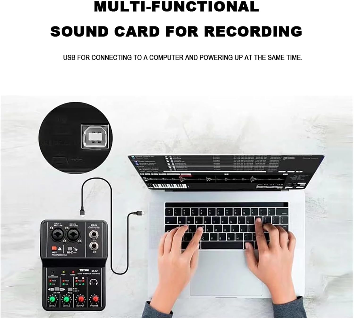 This mixer is a multi-purpose with a sound card 4Channel mixer,Can satisfy the user's family music production,Live webcast,KSong cover and other needsProduct characteristics:The mixer is equipped、Input Gain and High Bass Adjustment、Built-in 48V Phantom power supply is suitable for direct power supply of condenser microphone、High Definition Headset Output Port、MP3 Player、 reception、With connection PC Sound card。The mixer is small in size.、Lightweight,Can be directly connected PC The Port power supply,No additional power supply required,Can be through Connect the computer to supply power to run,The trouble of using an external adapter is saved.,You can also use mobile power or AC/DCThe adapter powers it.Added a PAD button to minimize the howling sound from the microphone and give you a better music experience.The mixer has 1 MIC/LINE mono and 4 stereo input jacks with 48V phantom power. Cinch socket () with 2 tracks. You can also play music quickly via MP3/Bluetooth connectionTypc-c power socket, 5V/1a, can be connected to the computer interface for power supply, and can be used as a sound card; it can also be powered by a power adapter or a mobile power supply.The sound board mixer features an elegant design with a white control board, sturdy metal construction, and complete functions that suit your need for an easy mix.It is an audio solution for small stages, gigs, home studios, , DJ parties, etc.Package list:Mixer console *1Power cable *1Manual *1