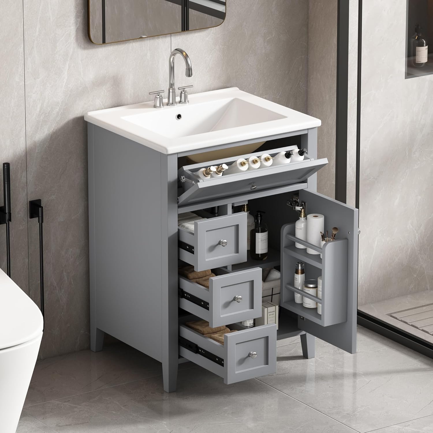 | Item Type Name | 24" Bathroom Vanities Sink Set, Cabinet with Multi-functional Tip-out Drawer and Adjustable Shelf, Soft-closing Door, Solid Wood Legs, Gray |