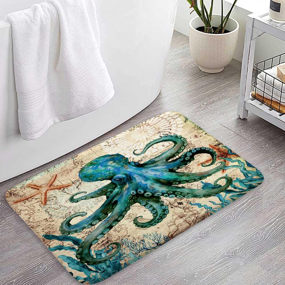 Transform your bathroom into a delightful oasis with our Funny Cat Dinosaur & Vintage Nautical Octopus Bathroom Set. This unique combination brings together two distinct yet complementary designs, offering both functionality and style. The Funny Cat Dinosaur Shower Curtain features a playful and imaginative design, with cats dressed as dinosaurs set against a backdrop of Japanese ocean waves. Made from high-quality, water-resistant fabric, this 70x70-inch curtain is not only durable but also adds a vibrant and whimsical touch to your bathroom decor. The fabric is easy to clean, simply toss it in the washing machine for a fresh look. Complementing the shower curtain is the Vintage Nautical Octopus Bath Mat. This 29x17-inch mat is crafted with a soft, absorbent memory foam core, providing a plush and comfortable surface underfoot. The retro ocean beach design, featuring a detailed octopus illustration, adds a touch of nautical charm to your bathroom. The mat is non-slip, ensuring safety, and is water-absorbent, keeping your floors dry. Together, these pieces create a cohesive and inviting bathroom theme that is both functional and stylish. Whether you're redecorating or simply looking to add a touch of personality to your space, this set is sure to impress. Perfect for kids' bathrooms, rustic farmhouse decor, or anyone who loves a blend of whimsy and retro charm, this Funny Cat Dinosaur & Vintage Nautical Octopus Bathroom Set is a must-have for your home.
