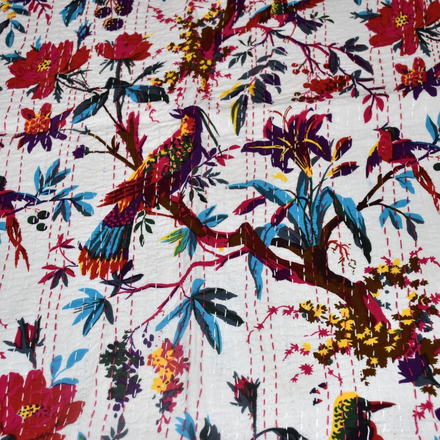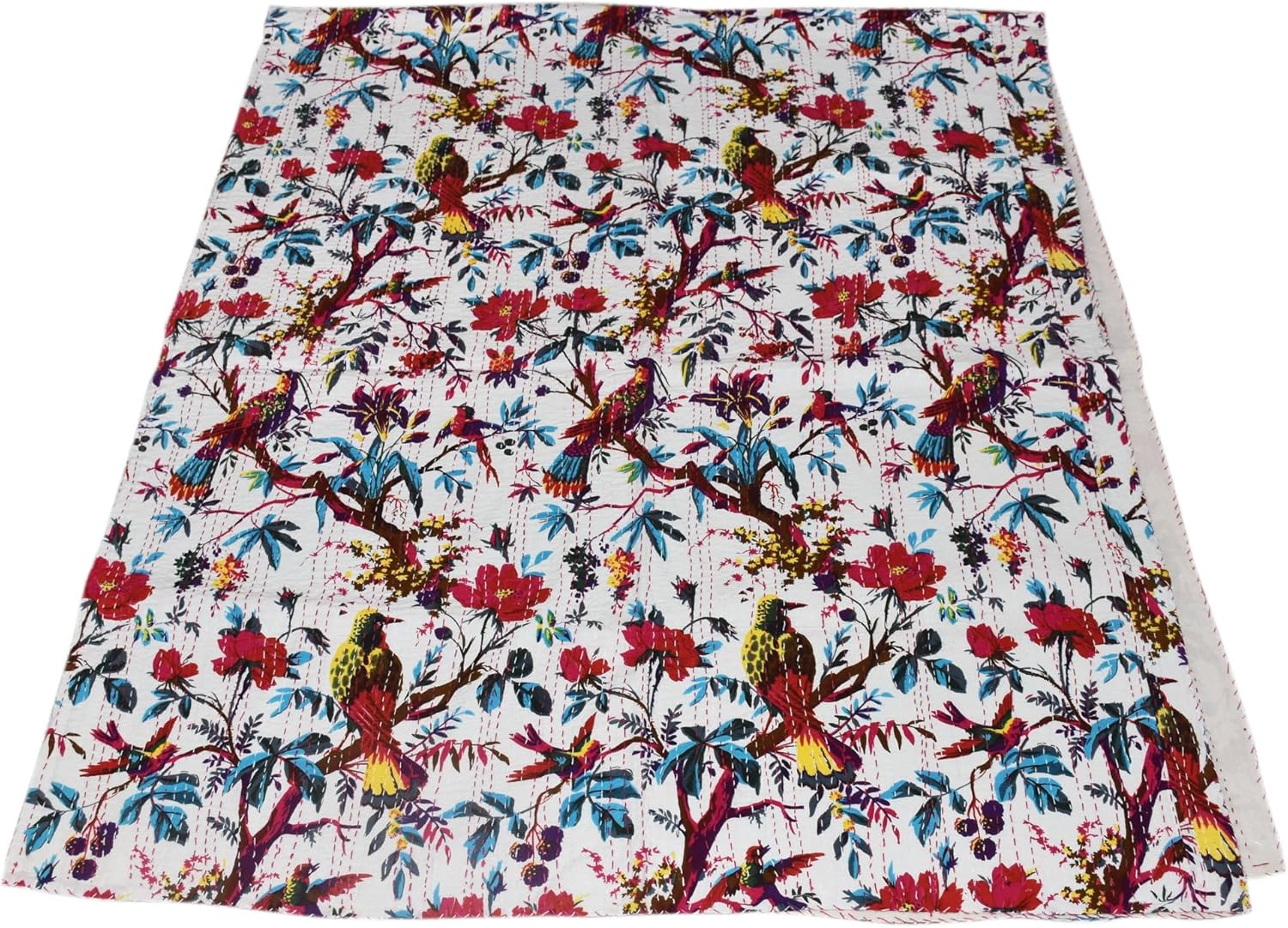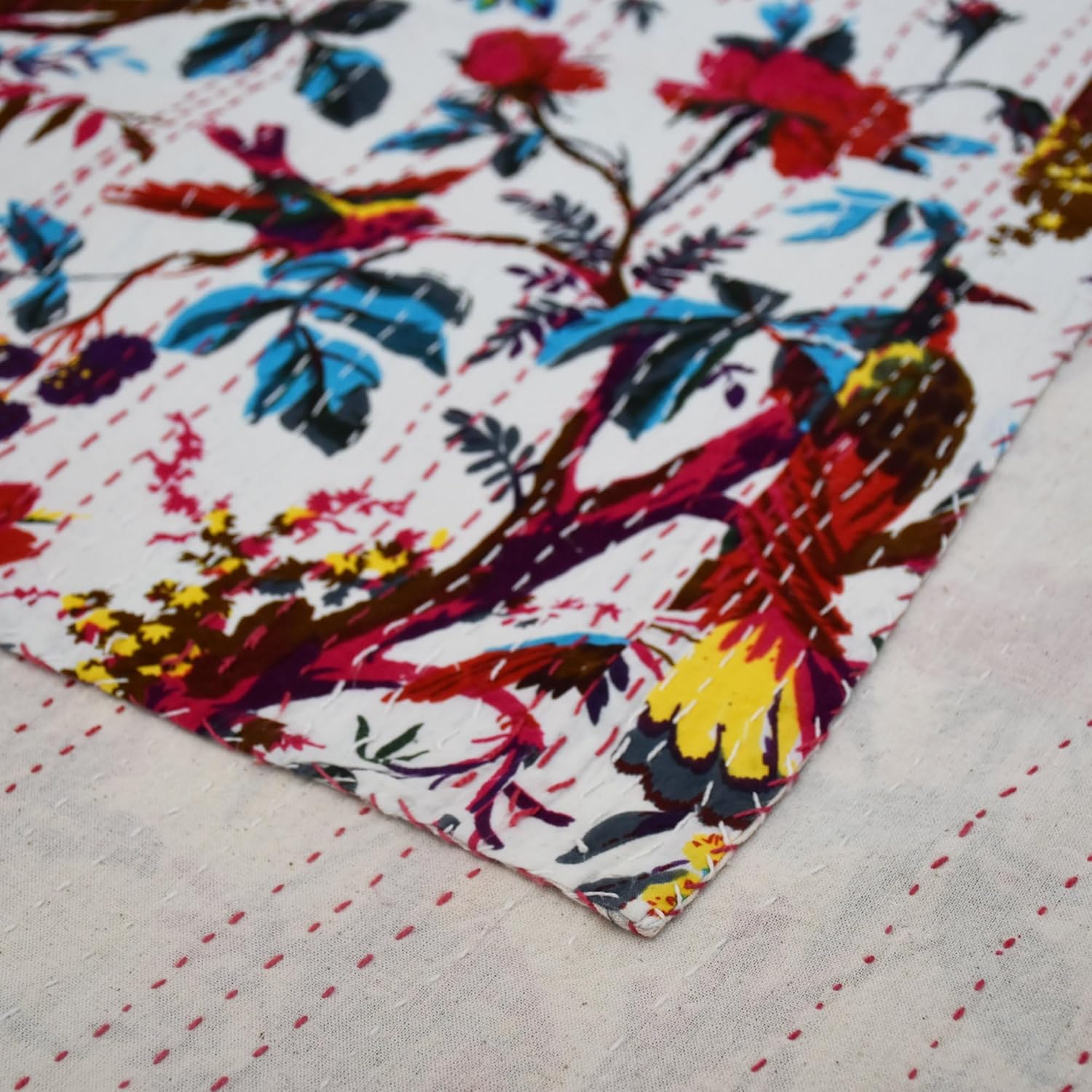 Made with 100% cotton and natural vegetable colors. This piece is of art is completely hand stitched by Women artisan in Rajasthan, India. A beautiful creation to give your home a traditional yet authentic colorful look with this beautiful kantha quilt blanket or throw which can also be used as handmade tropical Kantha bedspread bedding. This piece is of art is completely hand stitched by Women artisan in Rajasthan, India. The entire quilt is hand embroidered with end number of straight running stitches to create a unique product, one of it's kind.These quilts are famed and admired due to their Kantha work. They have different beautiful warm and charming colors, designs and patterns on either side which gives a distinct look. These cotton lightweight "Quilts" can be used as Bedspread , Bedding Throw , Blanket Or Quilt, A Summer Bed Cover, A Fabulous Picnic Rug, Nice Bedroom Quilt This can fit to a King size bed as blanket or throw or can easily fit as bedspread / bed cover to King bed . Washing Instruction – Easy To Hand Wash & Dry Clean.