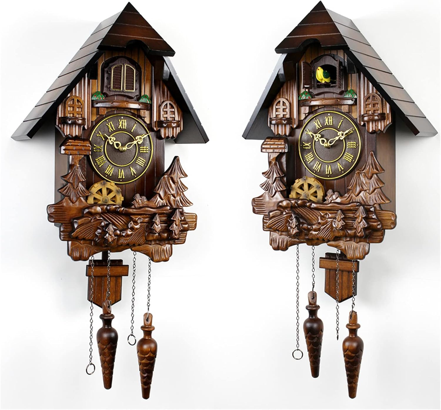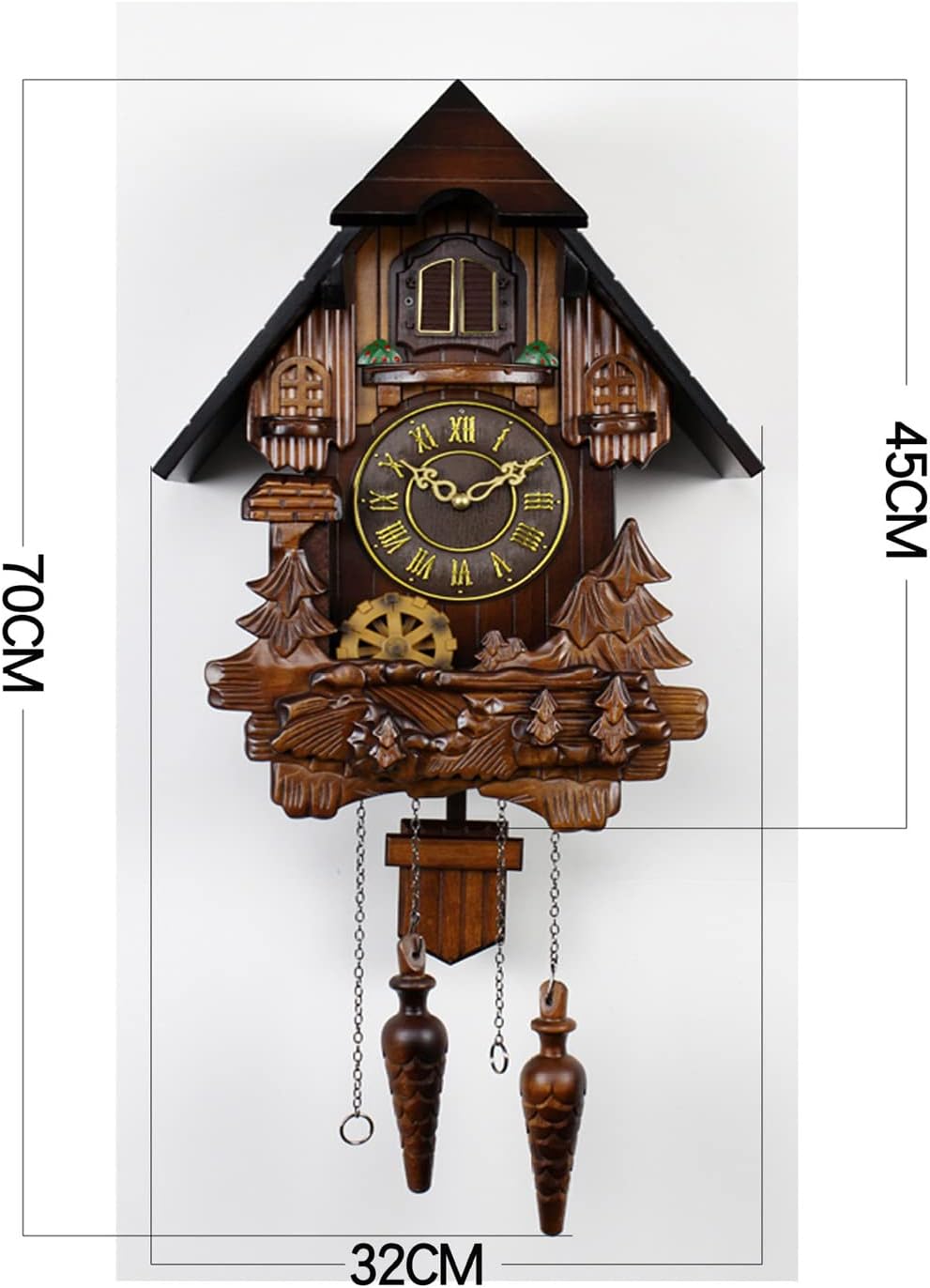 Decoring your home gives the illusion that your life is more interesting than it really is. Are you looking for a cuckoo clock that won't be too expensive- the Decorative classic, to complete the mood and look of your home Our cuckoo clock is the right choice for you. It features in classic look with hand-crafted details, delicious tone, and superior timekeeping abilities. It is mainly made of top quality solid wood, and definitely can provide just the right touch of class to your home. details Cuckoo comes out and sings co co every hour. Just like being in the forest, you can not only hear the cuckoo, but also the gurgle of creek, and the echo of the cuckoo in the valley. Decorative pendulum and pine cones are suspended beneath the case, which add to the overall aesthetic. 3-speed chiming switch,Cuckoo clock chimes on the hour, waterwheel rotation. sensor Volume Control - The volume is adjustable from ON to OFF or LOW. Light Sensor - The cuckoo call and music automatically silence in the dark Material: Basswood raw material Dimensions (H×W×D): 45×32×15CM Color: brown Weight: 3KG Battery: 2 x 1AA batteries (not included)