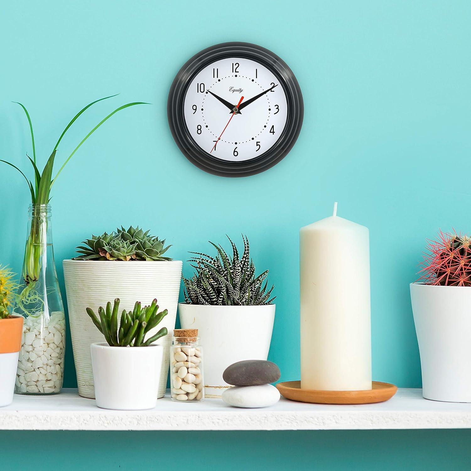 Elevate your home's style and functionality with the Equity by La Crosse 8-Inch Black Quartz Analog Clock. This wall-mounted timepiece blends modern aesthetics with classic timekeeping, perfect for any room in your house. Featuring reliable quartz movement, this clock ensures accurate timekeeping without frequent adjustments. The battery-powered mechanism offers hassle-free operation with a soft, unobtrusive ticking sound, ideal for quiet environments. The clock face boasts excellent visibility with bold black numerals on a crisp white background, allowing easy time-checking from across the room. Metal hands in black and red enhance readability and add sophistication. Built to last, the clock features a durable recycled plastic case in sleek black, demonstrating both style and sustainability. A protective glass lens shields the face, ensuring long-lasting clarity. Installation is simple with included mounting hardware. Operating on a single AA battery (not included), this 8-inch diameter clock offers flexible placement without cords or outlets. The Equity by La Crosse 8-Inch Black Quartz Analog Clock is more than a timepiece; it's a functional decor piece that enhances your home's ambiance. Its clean, timeless design complements various interior styles, making it perfect for any space or as a thoughtful gift.