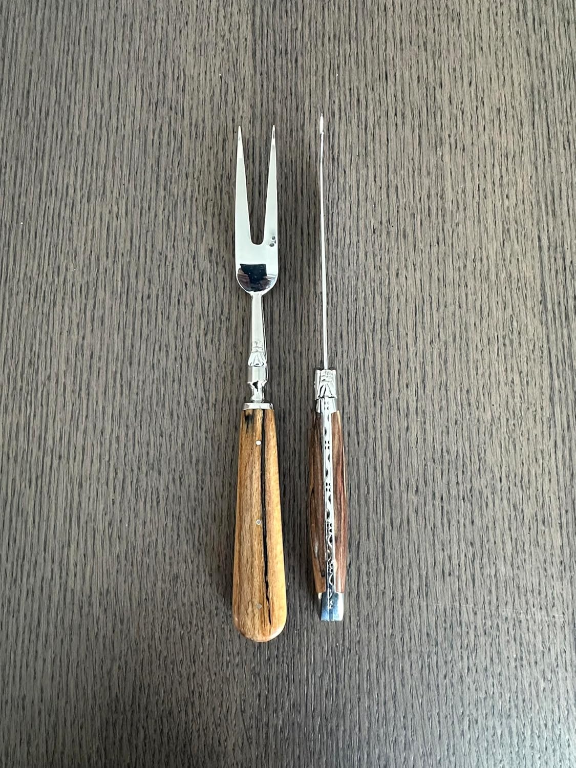 Be assured that what you are getting is an original Laguiole en Aubrac cheese knife set made by master craftsmen with authentic materials. These heirloom-quality knives, designed to last a lifetime and crafted by French artisans with the highest-quality materials, make a truly special gift for wedding or corporate events, finely crafted knives. An exquisite gift or elegant complement to your wine & cheese fete. Genuine Laguiole en Aubrac cheese knives are hand-made in France by master craftsmen with authentic French components and are guaranteed for life. Made of ultra strong 12c27 Sandvik Stainless Steel that will avoid corrosion of the blade. An exquisite gift or elegant complement to your cheese collection. 5-in soft cheese blade, 9.75-in total length; 6-in fork, 10-in total length. Cheese knife and fork come with polished stainless steel bolsters. The distinctive Laguiole bee is featured on the bolsters. Includes a decorative chasing on the metal spine, serving as the signature of the craftsman who made the knife. Includes a certificate of authenticity and a lifetime warranty. Lifetime warranty covers any manufacturing defects. Any Laguiole en Aubrac product failure resulting in the inability to use the folding knife as it was intended. Laguiole en Aubrac will not repair or replace items that show obvious signs of neglect or intentional damages.
