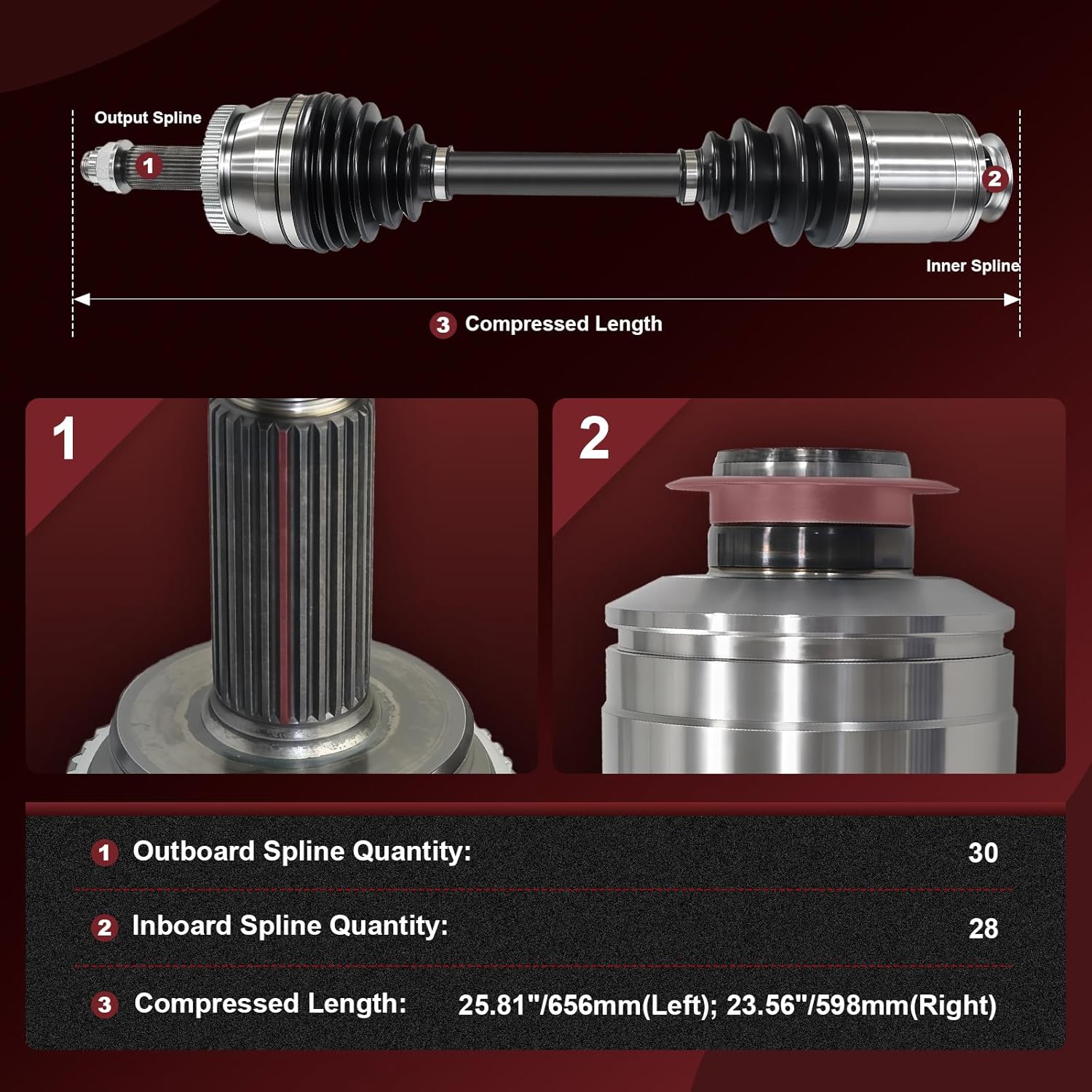 | Special Features | 1 Year Warranty, Anytek CV Axle Shaft Assembly is manufactured strictly according to the original standard., Axle Shaft can be installed directly. CV Axle is made of high-quality materials to ensure optimal performance. High quality chloroprene rubber boots that can withstand extreme high and low temperatures., ① Installation Position: Front Left & Right; ② Compressed Length: 655mm(Left), 598mm(Right); ③ Inboard Spline Quantity: 28; ④ Outboard Spline Quantity: 30; ⑤ ABS Tone Ring Tooth Quantity: 52T |