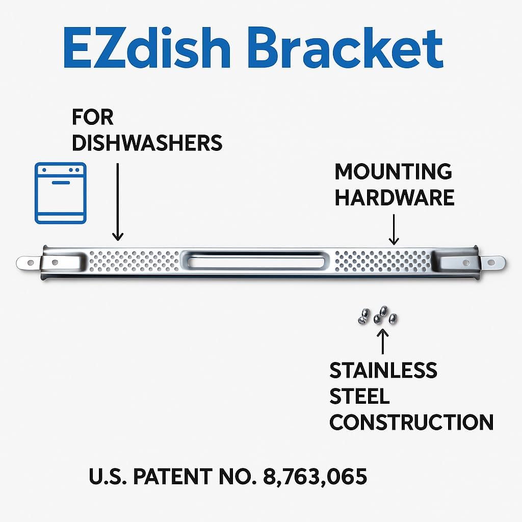 Made in USA from 22 gauge galvanized steel Eliminates dishwasher anchoring problems Accommodates virtually any dishwasher Easy installation under any type of counter top Can be installed prior to or after counter top installation Dishwasher does not have to be present at jobsite Won’t damage expensive cabinetry like kits that anchor to sides alone Eliminates return trip by counter top installer to anchor dishwasher Saves time AND money!