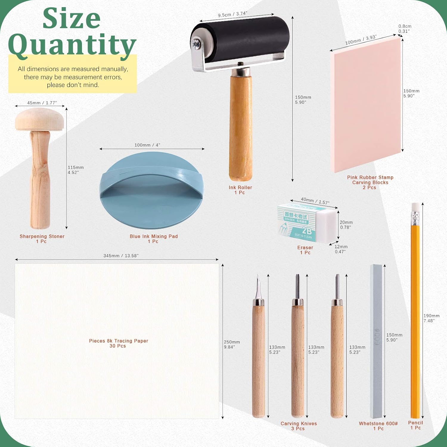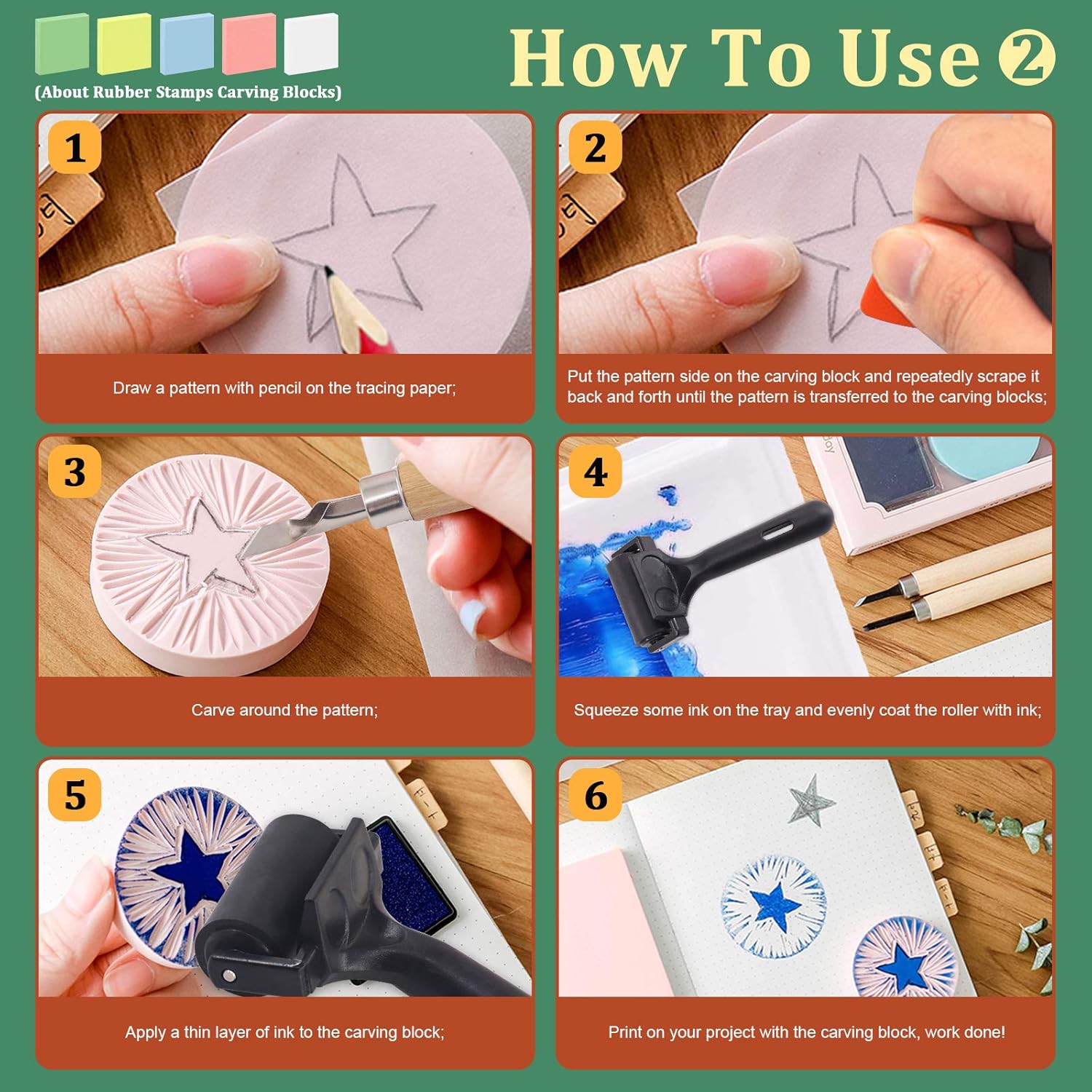 Keadic 41 Pieces Rubber Stamp Making Kit, Includes 2 Rubber Stamps Carving Blocks, 3 Carving Tools & Whetstone, Tracing Papers, Brayer Roller, Block Printing Tools for Stamp Carving and Printmaking Specification Material: soft rubber Color of Carving Block: pink, pink, green, yellow, red, blue, white, orange Size: rubber stamp carving block: 6 × 4 × 0.3 inch (15 × 10 × 0.8 CM) blue ink mixing pad: 4 inch/10cm brayer roller: 4 inches/10cm wood stamp: 4.5 × 2 inch (11.5 × 5 CM) tracing papers: 16.5 x 11.7 inch / 42 x 29.7 cm square rubber stamp carving block: 2 inch × 2 inch × 0.4 inch Package Included 2 pcs × pink rubber stamp carving blocks 1 pcs × 4 inch ink roller 3 pcs × carving tools 1 pcs × whetstone 600# 1 pcs × pencil 1 pcs × eraser 1 pcs × blue ink mixing pad 1 pcs × wooden stamp 30 pcs × 8k tracing paper 5pcs * square rubber stamps carving blocks (red/1pcs, white/1pcs, blue/1pcs, green/1pcs, yellow/1pcs) 5pcs * square double-sided removable carving blocks (blue/1pcs, green/1pcs, pink/1pcs, yellow/1pcs, orange/1pcs) 3pcs * carving tools with different cutting edges 1pcs * whetstone 600# HOW TO USE? Step 1. Draw a pattern with pencil on the tracing paper; Step 2. Put the pattern side on the carving block and repeatedly scrape it back and forth until the pattern is transferred to the carving blocks; Step 3. Carve around the pattern; Step 4. Squeeze some ink on the tray and evenly coat the roller with ink; Step 5. Apply a thin layer of ink to the carving block; Step 6. Print on your project with the carving block, work done!