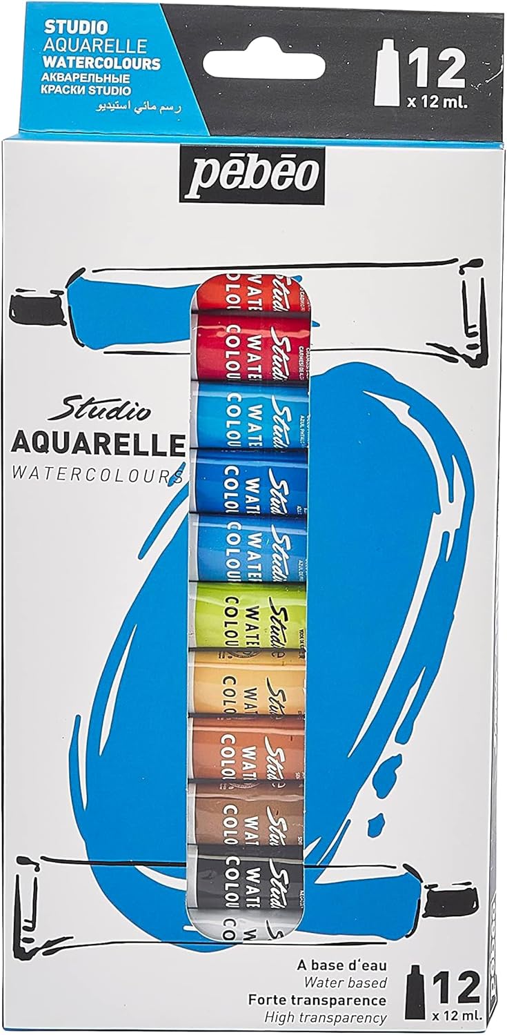 Designed in the craftsman tradition of Pebeo watercolours, Pebeo's fine Watercolour range has been carefully selected to meet the needs of watercolour lovers. The range offers a balanced selection of 28 shades harmoniously distribued across the colour wheel that are easy to thin and provide a depth of tone and transparency that is retained when dry. Conforms to ASTM D-4236. This set includes 24 assorted 12 ml tubes : primary lemon yellow, Cad. Yellow pale, dark cadmium yellow, orange, cadmium red, alizarin crimson, Dark ultramarine , primary phthalo blue, cobalt blue, prussian blue, INDIGO BLUE, permanent green, sap green, phtalo green, Green earth, Yellow ochre, Burnt Sienna, Burnt umber, sepia, Payne’s grey, Ivory black, china white