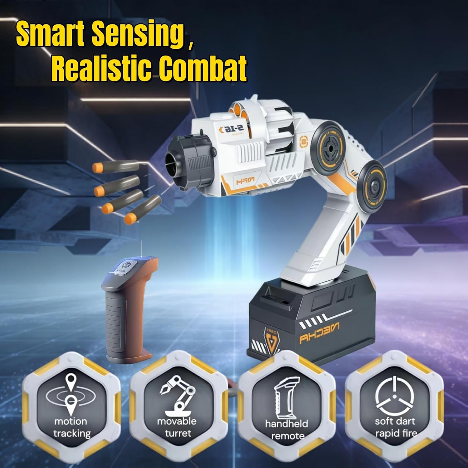 This remote control smart robot turret blaster toy set includes a matching tactical vest ,motion-controlled headset and controlled launcher,with a stable structure and sensitive response for smooth and reliable operation. It features a multi-angle adjustable design that supports precise aiming and flexible shooting angles for diverse interactive play scenarios. The responsive remote control system offers easy and flexible operation, bringing users an immersive tactical experience. Designed with safe soft bullets, this product ensures secure and friendly operation while delivering exciting entertainment. As a complete wearable tactical play set, it provides a full precision shooting system with stable performance and rich interactive fun, making it an excellent choice for tactical-themed interactive play.